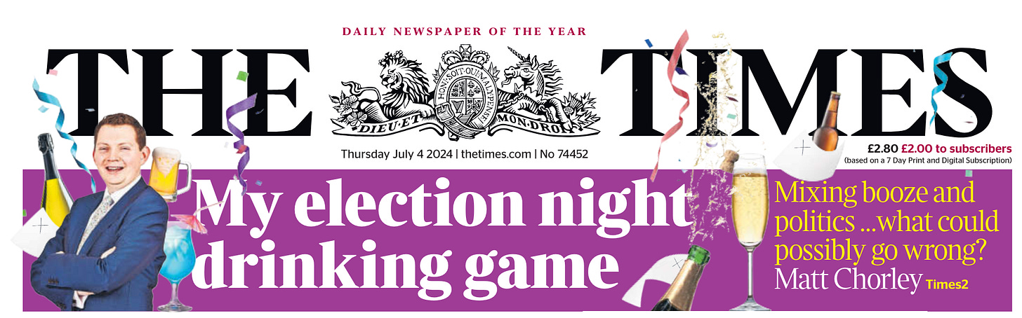 But the big one to keep an eye out for is the geographically-confused South West Norfolk, home to the economically-confused Liz Truss. In theory it’s a safe Tory seat and it’s not due to declare until around 5.30am, so only one for the truly committed. But wowsers, imagine that. A former Tory prime minister losing their seat. It happened in 1906 when Arthur Balfour was swept aside in the Liberal landslide. The Conservatives were reduced to a rump of just 156. Or what we now call “Rishi Sunak’s wildest dreams”. Go online now to search for “lettuce liqueurs”.